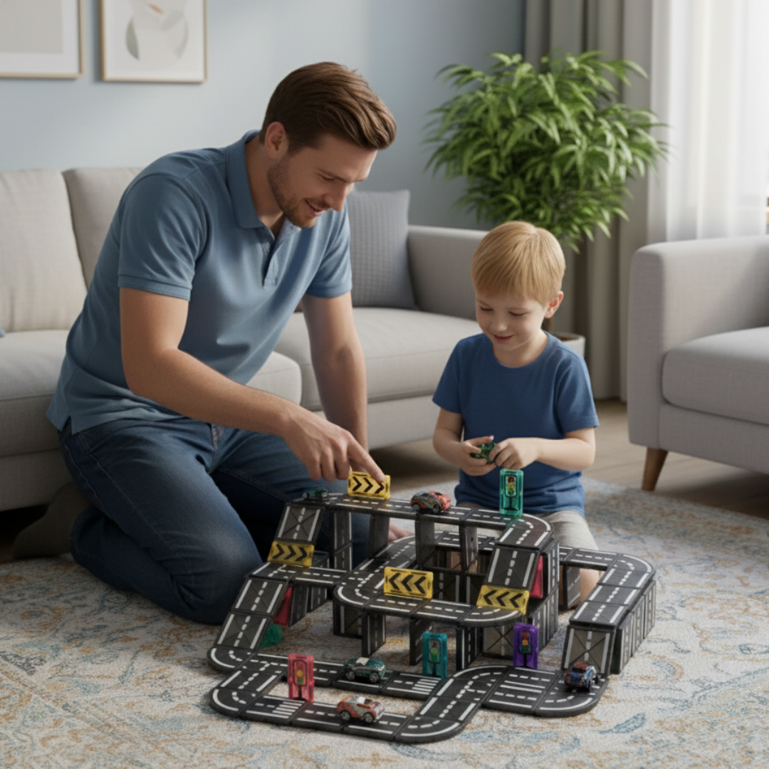 Dankzij de slimme magneetverbindingen klikken de onderdelen makkelijk in elkaar. Zo kunnen kinderen al vanaf jonge leeftijd zelfstandig hun eigen parcours bouwen en direct racen met hun auto's. De spanning stijgt telkens als de auto's over de baan zoeven richting de finish.